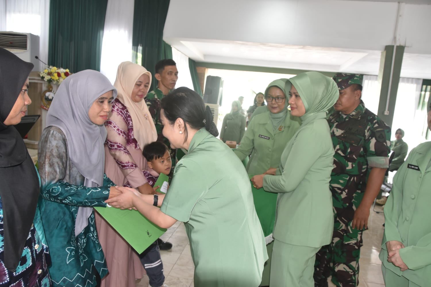 Usai memberikan pengarahan kepada anggota Persit, Ny. Amalya Zainul Arifn, memberikan Tali asih kepada Warakawuri, Isteri Prajurit yang sakit dan Anak Anggota yang berkebutuhan khusus.(pen1002hst).