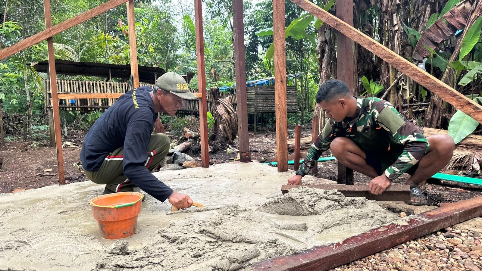 Pada tahap ini, anggota Satgas menyiapkan campuran semen, pasir, dan kerikil sebelum dituangkan dan diratakan ke seluruh permukaan lantai rumah. Pengecoran lantai menjadi tahapan penting untuk memastikan lantai rumah kokoh, rata, dan nyaman saat ditempati nantinya.