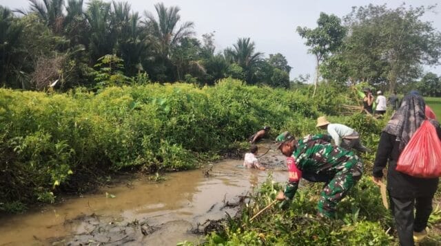 Cegah Banjir, Koramil 1002-03/Haruyan Turun Tangan Bersama Warga Bersihkan Irigasi